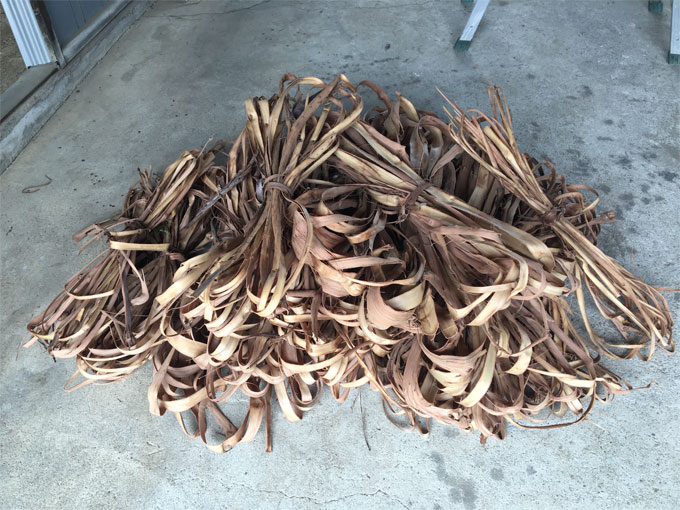 しかし、今年はお天気が良くなかったのであまり取ることはできませんでした。これだけの材料を取ってきても、厚み、幅、皮質を厳選すると籠バッグに使える材料はごくわずです。天然素材なので材料の質はバラバラなのは仕方がないですね。採ってきた山ぶどうの皮は表面のごみをひとつひとつ手で取り、大きさを揃えて保管しておきます。