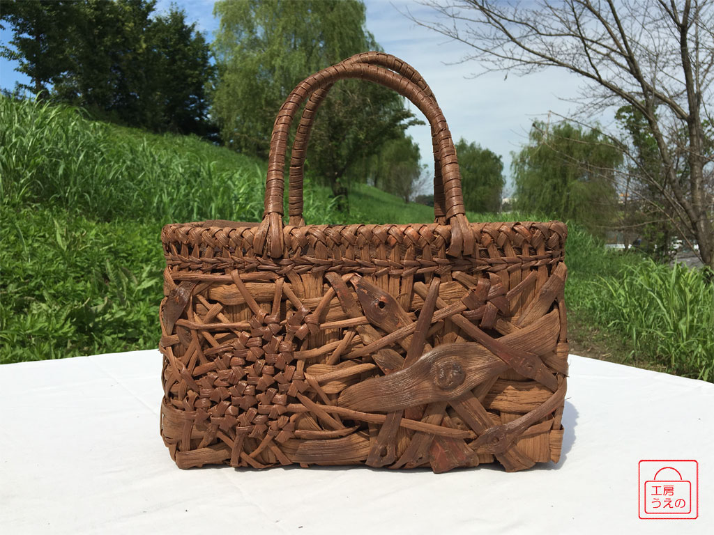 山葡萄のバッグ 組み替え網代編み 組み替え網代編み 材料:やまぶどう 作製:2016/9/16 斜めに左右に模様を分けた網代編みです。裏側も同様の模様になっています。 2016.09.25 山葡萄のバッグ