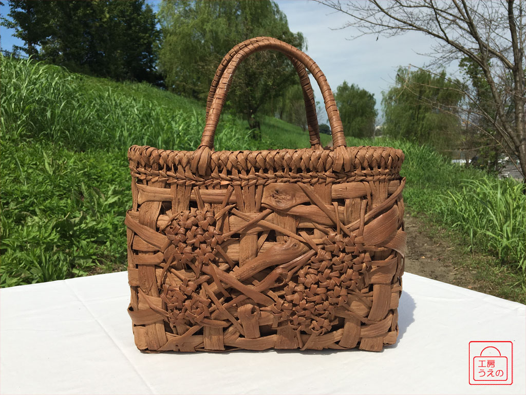 山葡萄のバッグ 乱れ編み(花編み入り) 乱れ編み(花編み入り)(1-1) 材料:やまぶどう 撮影:2016/9/6 大きな節と花編みのコントラストは特徴的な作品です。 2016.09.28 山葡萄のバッグ